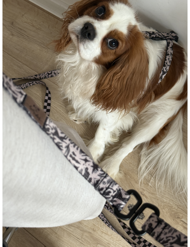 Smycz z dwójnikiem pozwala wygodnie prowadzić dwa psy jednocześnie, a obrotowy łącznik zapobiega skręcaniu linek.