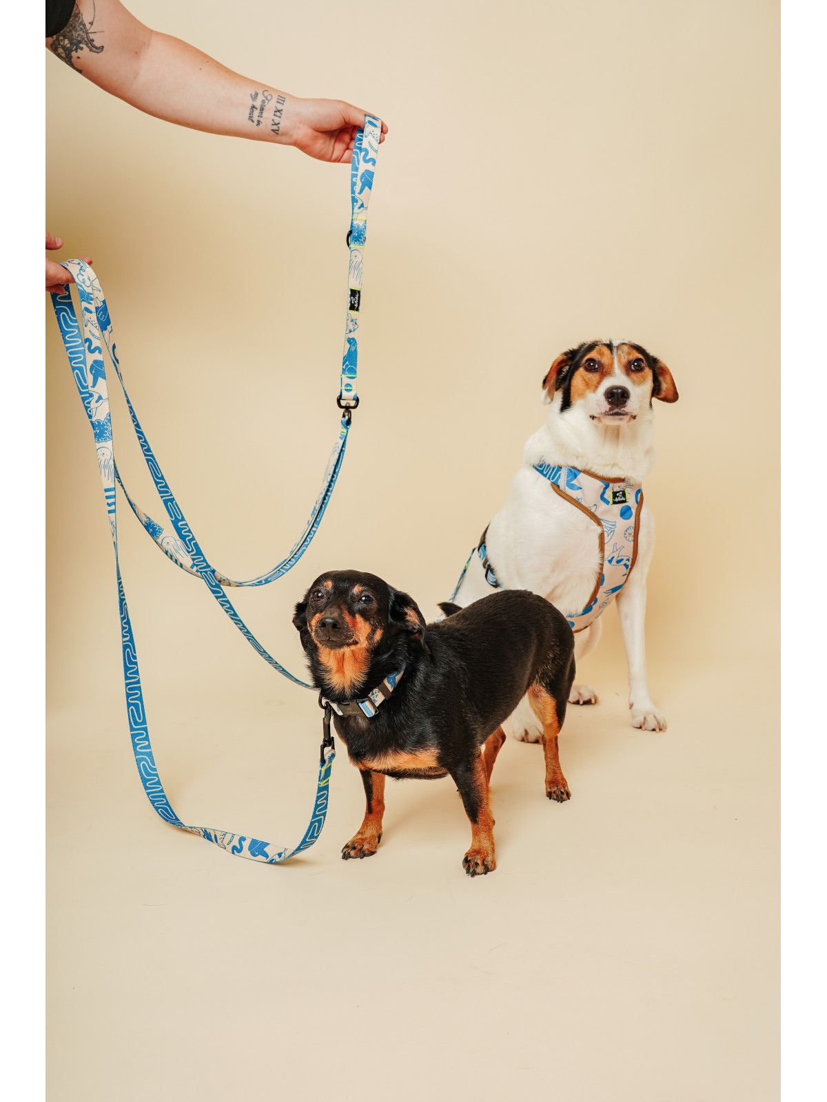 Smycz z dwójnikiem pozwala wygodnie prowadzić dwa psy jednocześnie, a obrotowy łącznik zapobiega skręcaniu linek.