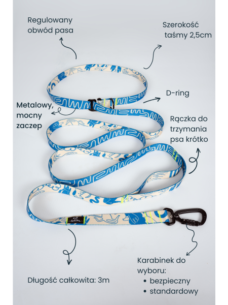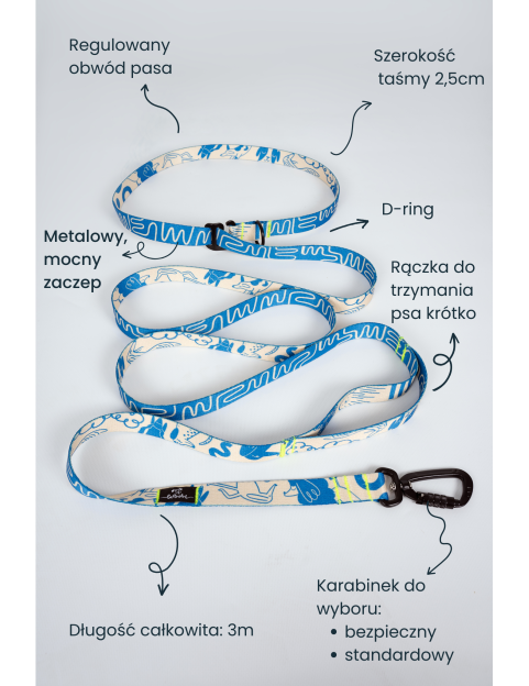 Wejdź na nowy poziom spacerów z naszą smyczą dla psa z pasem biodrowym o długości 3 metrów (szerokość taśmy 25 mm).