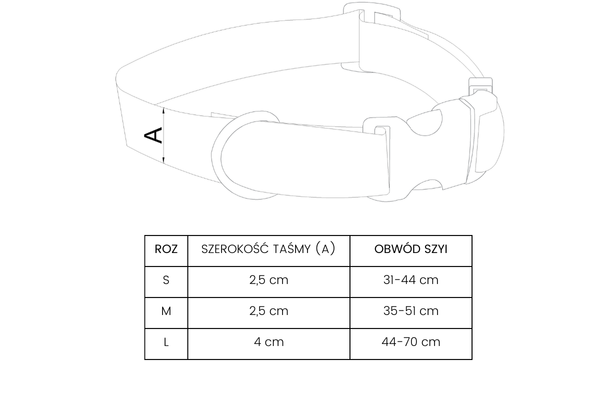 Obroża dostępna w trzech rozmiarach: S, M, L – idealnie pasuje zarówno dla małych, średnich, jak i dużych psów. Wykonana z trwałej taśmy o szerokości 2,5 cm (rozmiary S i M) lub 4 cm (rozmiar L), zapewnia komfort noszenia i solidne zapięcie.