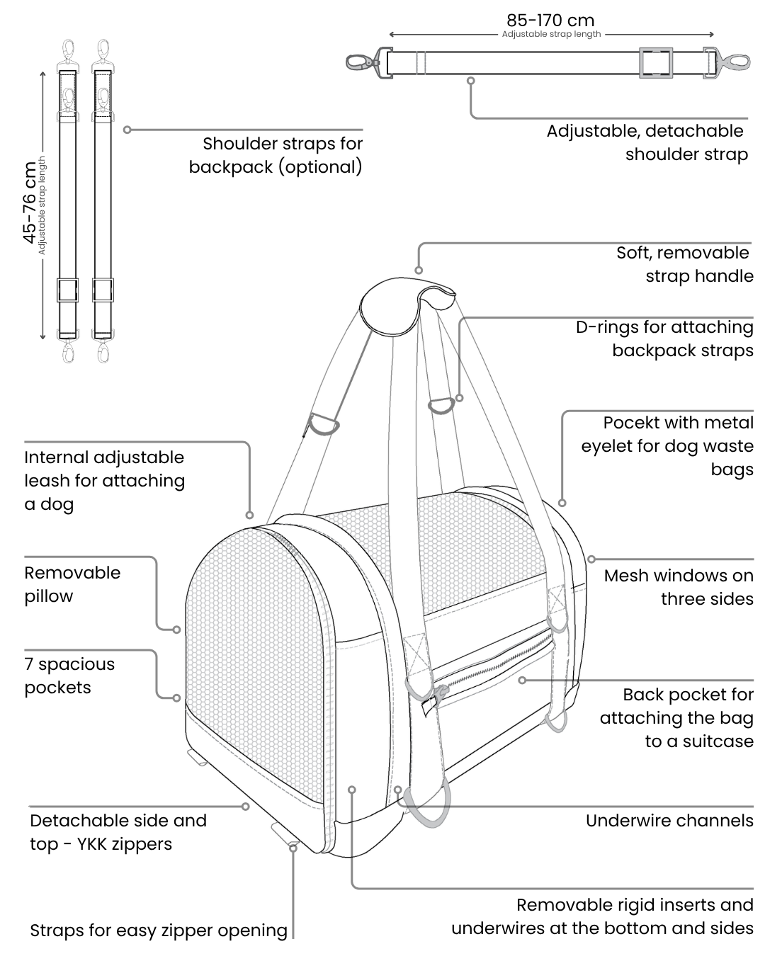 Our dog carrier / backpack is designed to meet airline standards, making it the perfect solution for air travel, as well as for car trips, walks, or shopping.