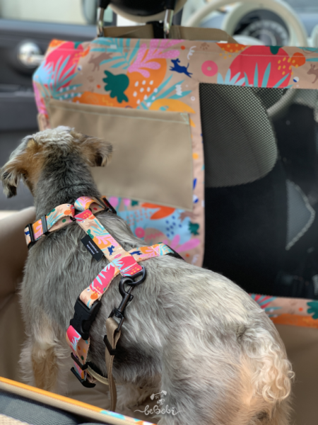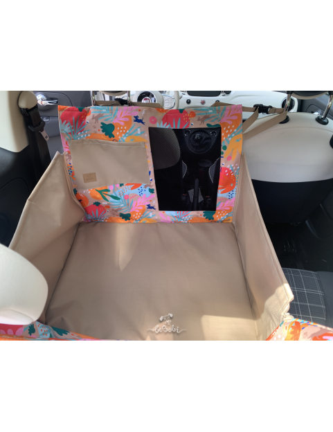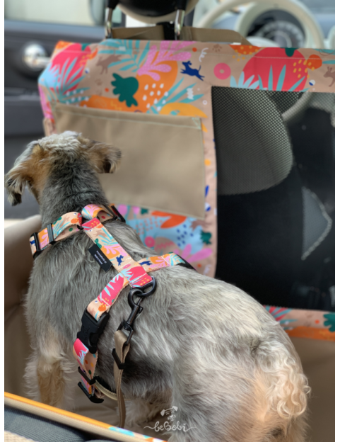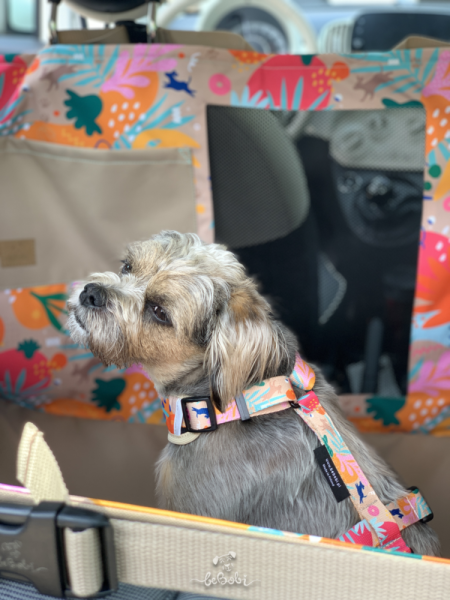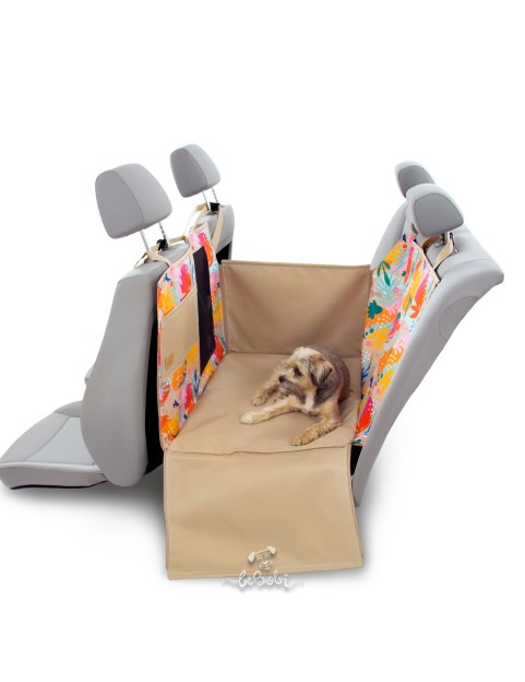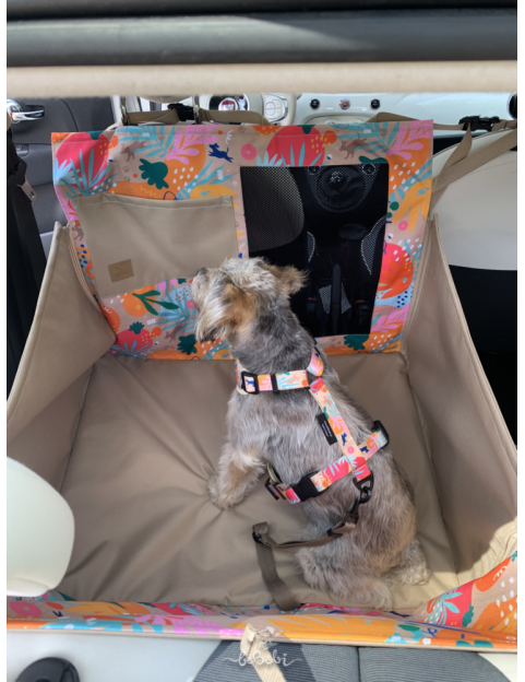 Brand new Dengu 2/3 dog car seat cover in HAU Are You Summer, designed for installation behind the front passenger seat. This is a test fabric prototype.