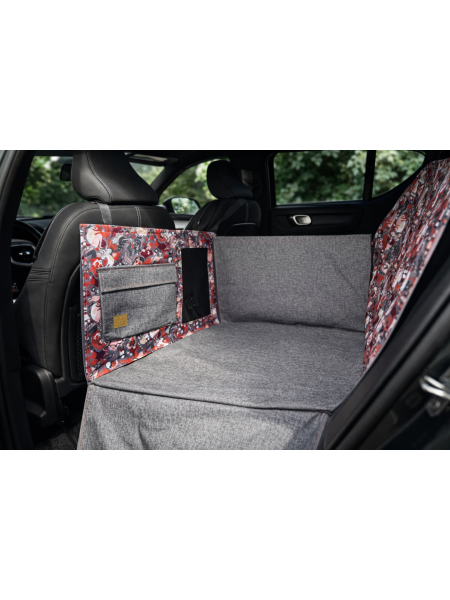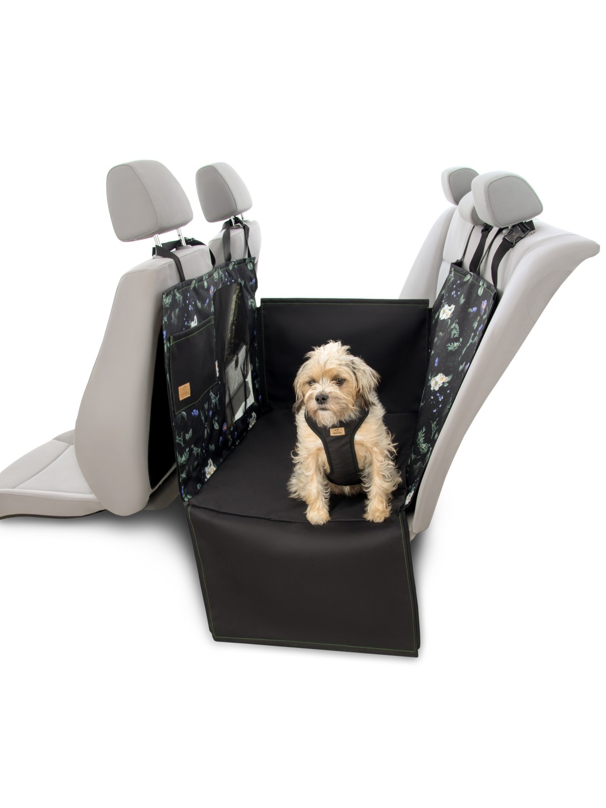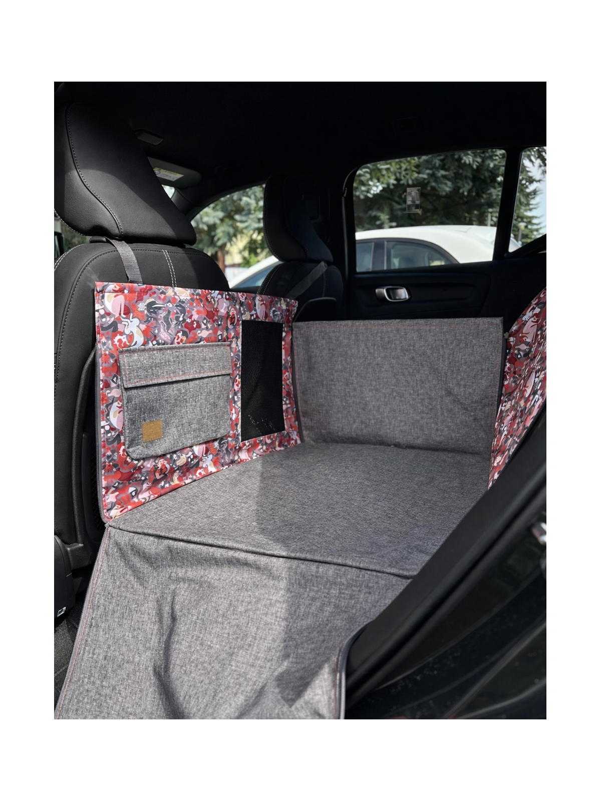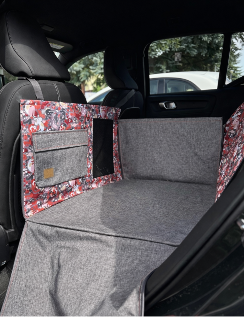 Brand new Dengu 2/3 dog car seat cover in PAWradise, designed for installation behind the driver seat. This is a test fabric prototype.