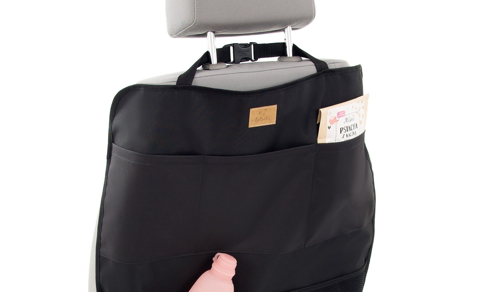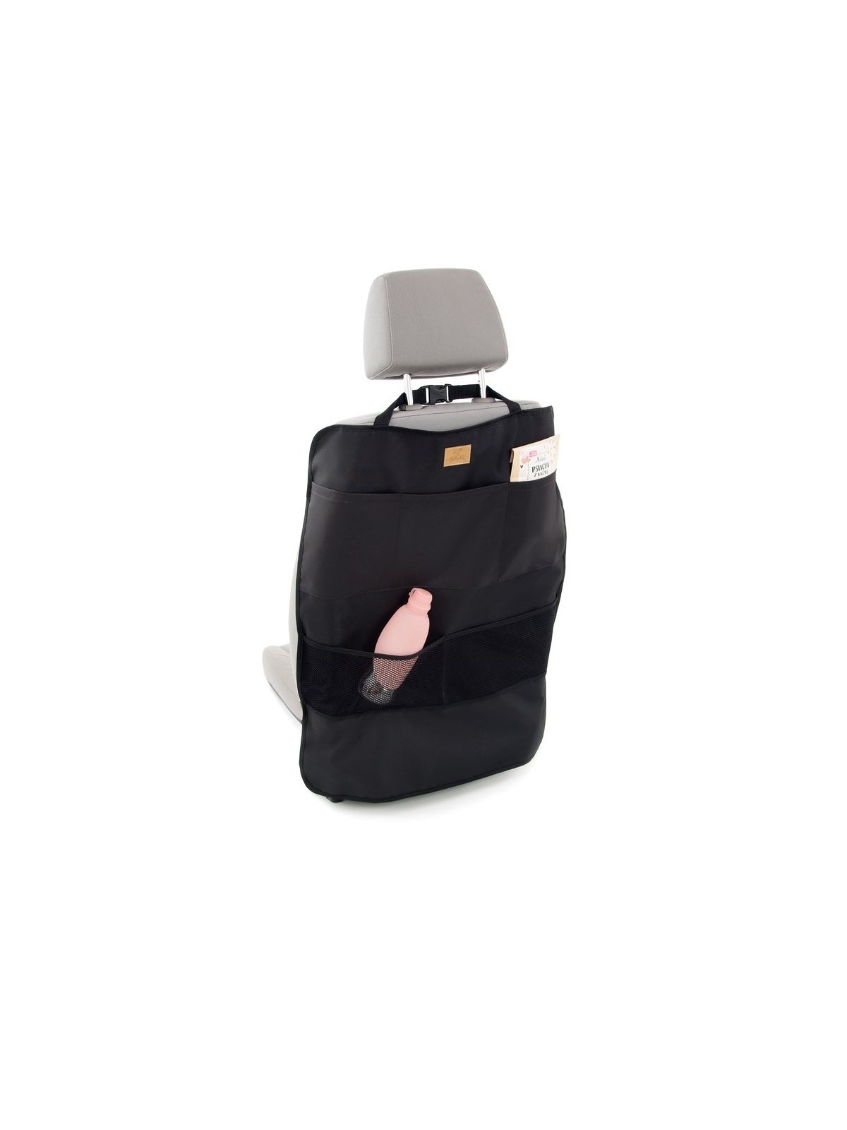 Kick mat protects back and sides of the front seat in the car.