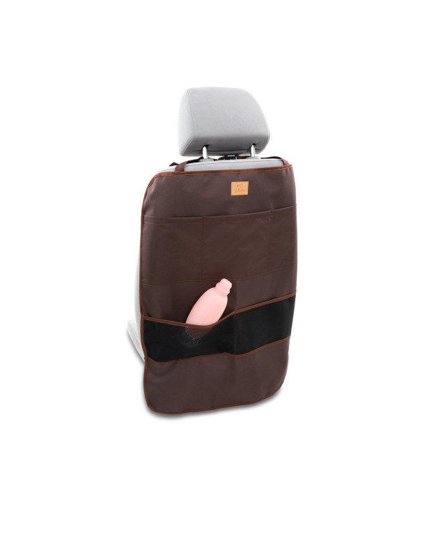 Kick mat protects back and sides of the front seat in the car.