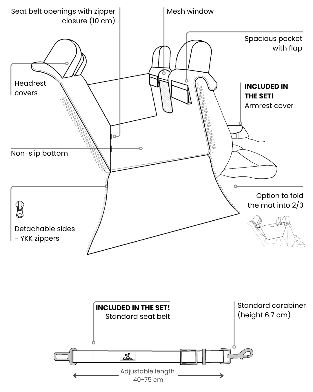 Kuko+ QUILTED dog car seat cover WITH SAFETY BELT