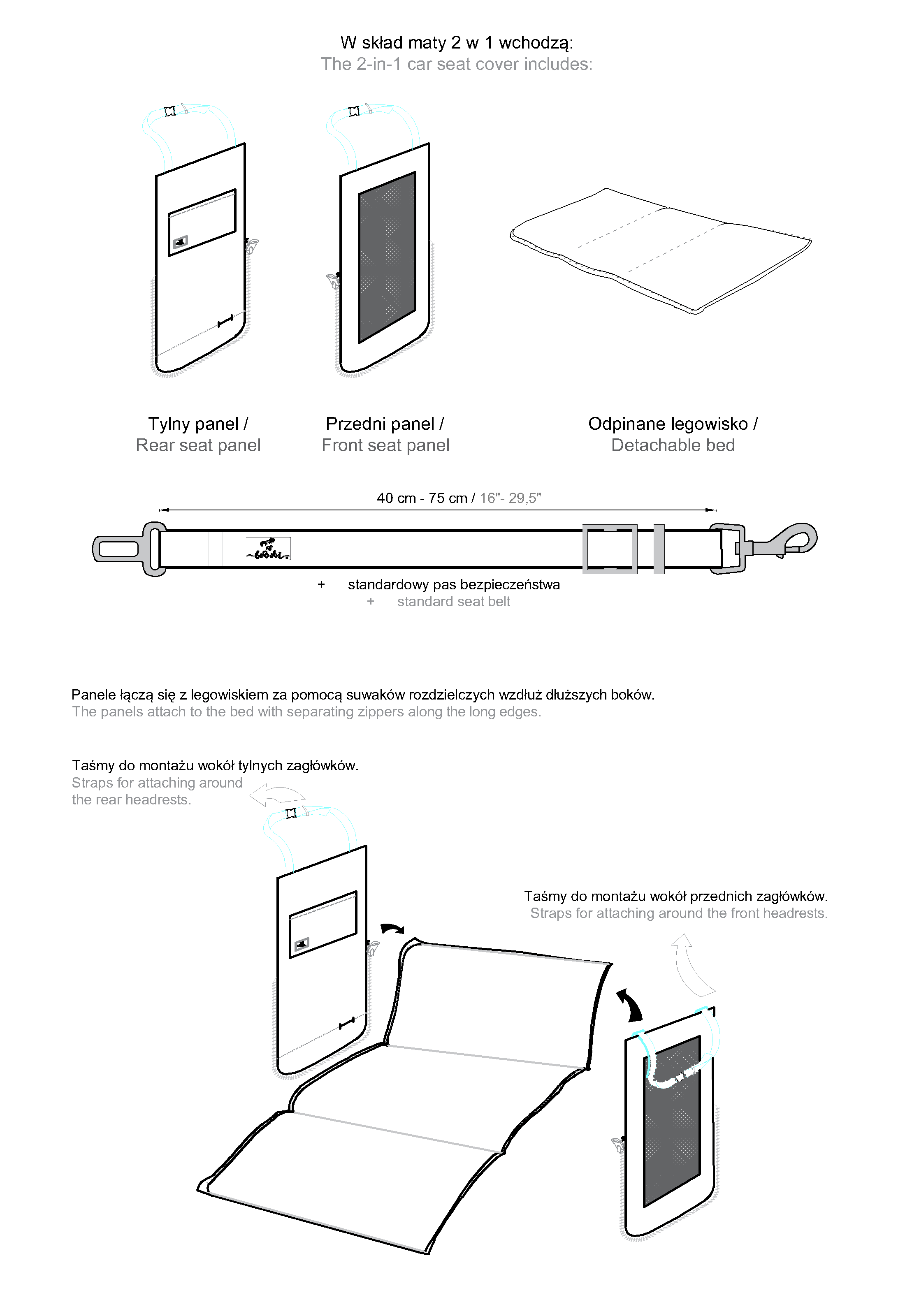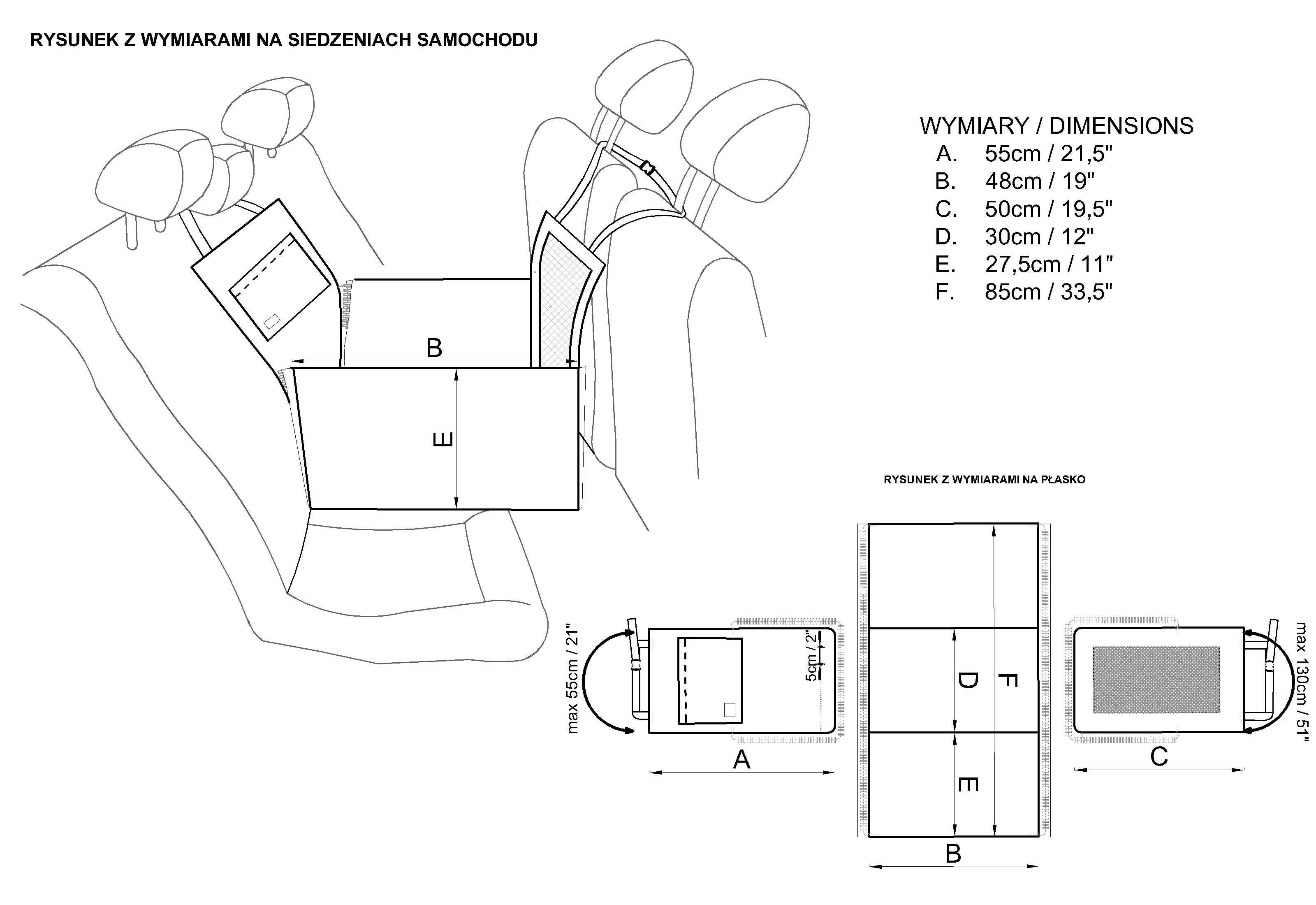 Headrests and pockets: Oxford (100% polyester with PU coating) – durable material with a custom-designed print. The PU layer adds resistance to moisture and damage.