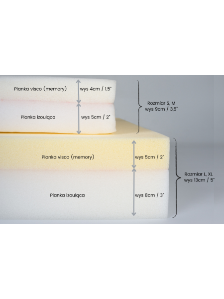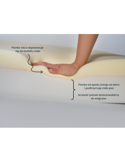 Nasze legowisko wykonane jest z połączenia dwóch wysokiej jakości materacy: ortopedyczna pianka visco, która dopasowuje się do kształtu ciała i pianka o wysokiej gęstości jako podparcie i izolacja od ziemi. Pianki są ze sobą połączone. Pianka visco dostosowuje się do kształtu ciała psa (pianka memory), zapewniając mu optymalne podparcie podczas snu.