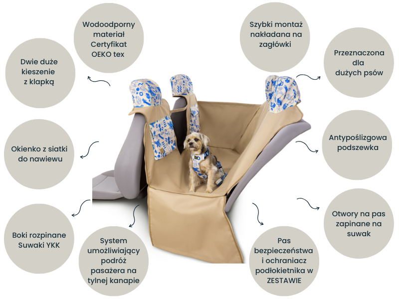 Przykładem jest mata samochodowa Kuko+, która chroni całą tylną kanapę razem z bokami i oparciem. Jeśli pies potrzebuje jeszcze większej stabilności podczas jazdy, można dodatkowo dokupić usztywnienie podłogi, które tworzy równą powierzchnię do leżenia.