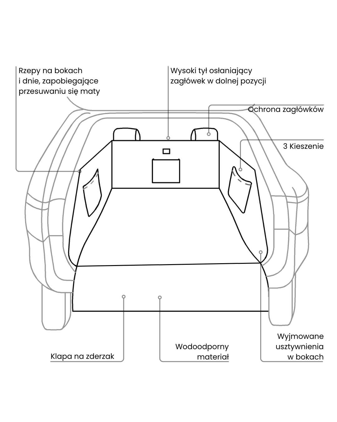 Mata do bagażnika to łatwo montowana za 2 zagłówki mata zabezpieczająca całość przestrzeni bagażnika samochodu.