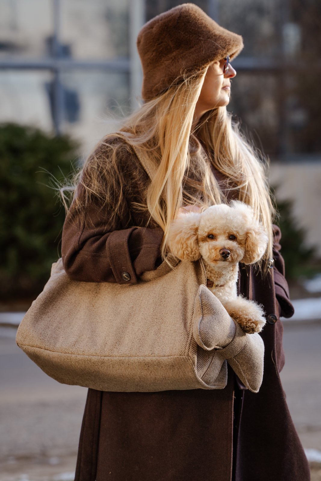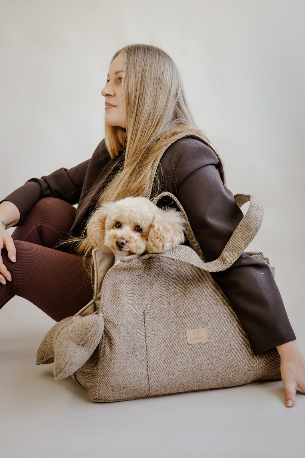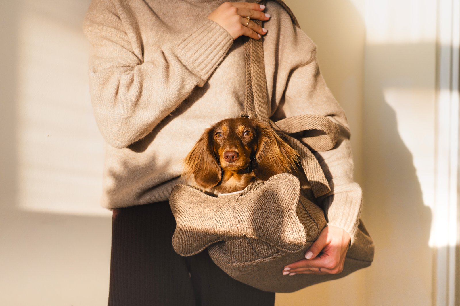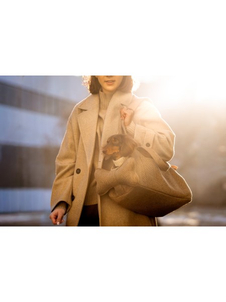 Torba na ramię dla małego psa do codziennych wyjść. Stabilna, miękka i wygodna w noszeniu, zaprojektowana tak, aby pies był blisko i czuł się bezpiecznie.