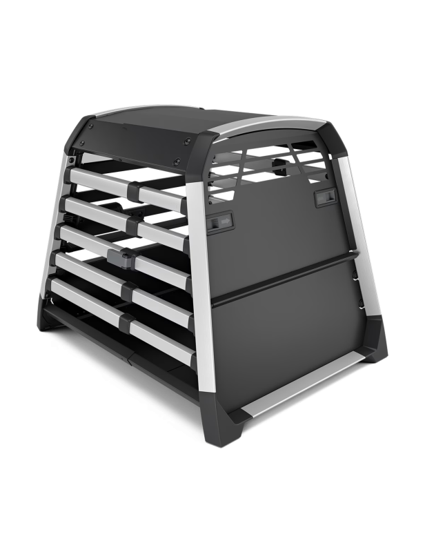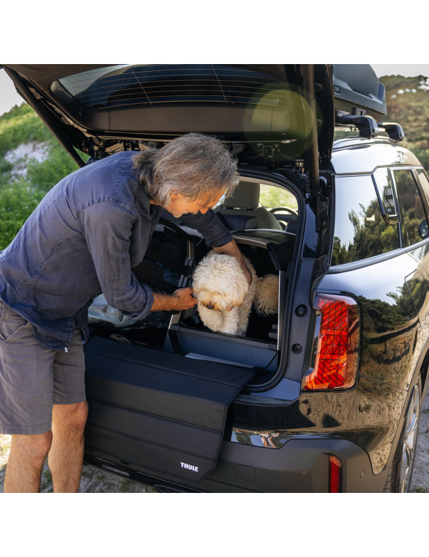 Bezpieczna, cicha i komfortowa klatka samochodowa dla psa Thule Allax stworzona z myślą o autach z progiem w bagażniku.